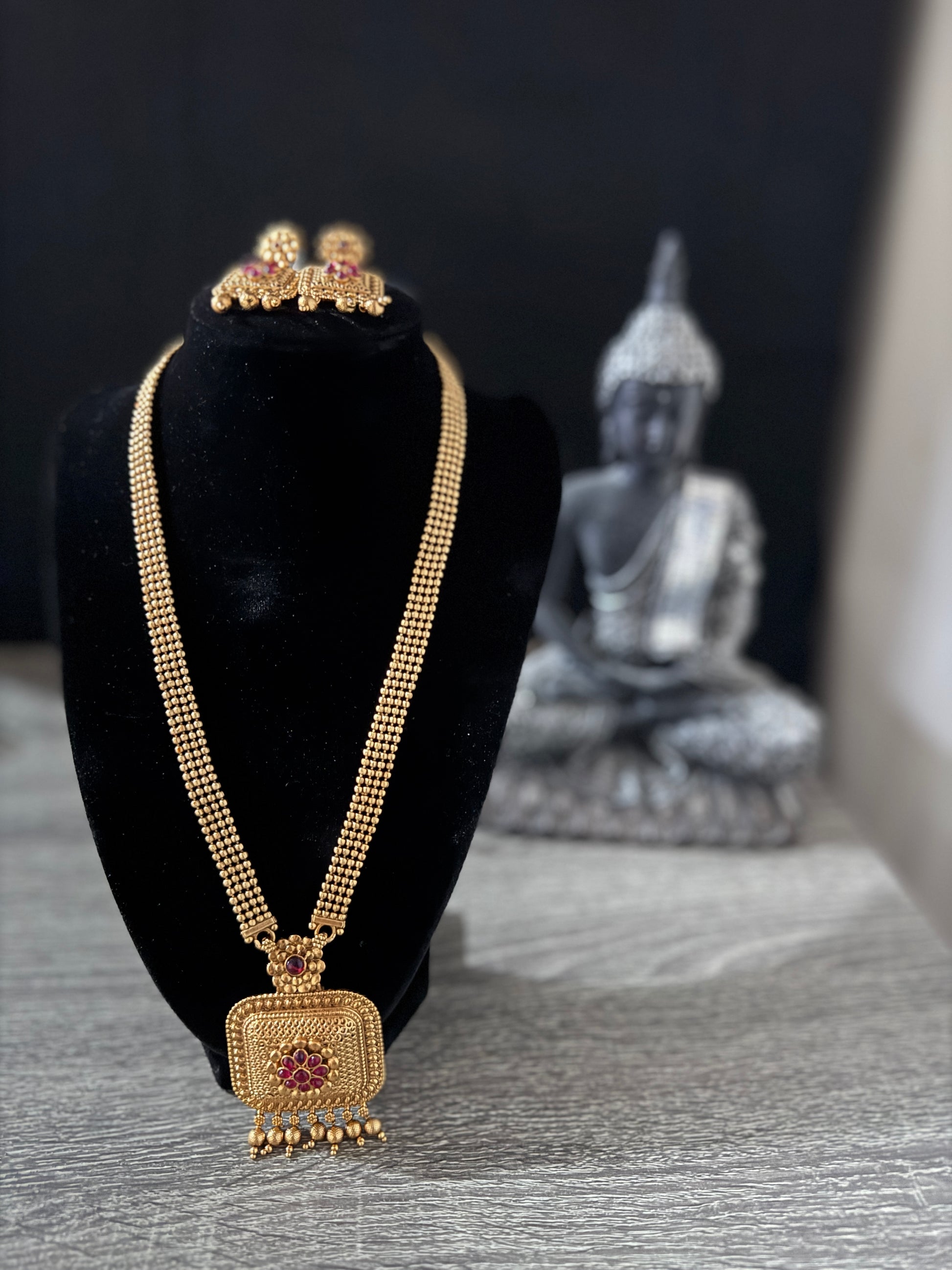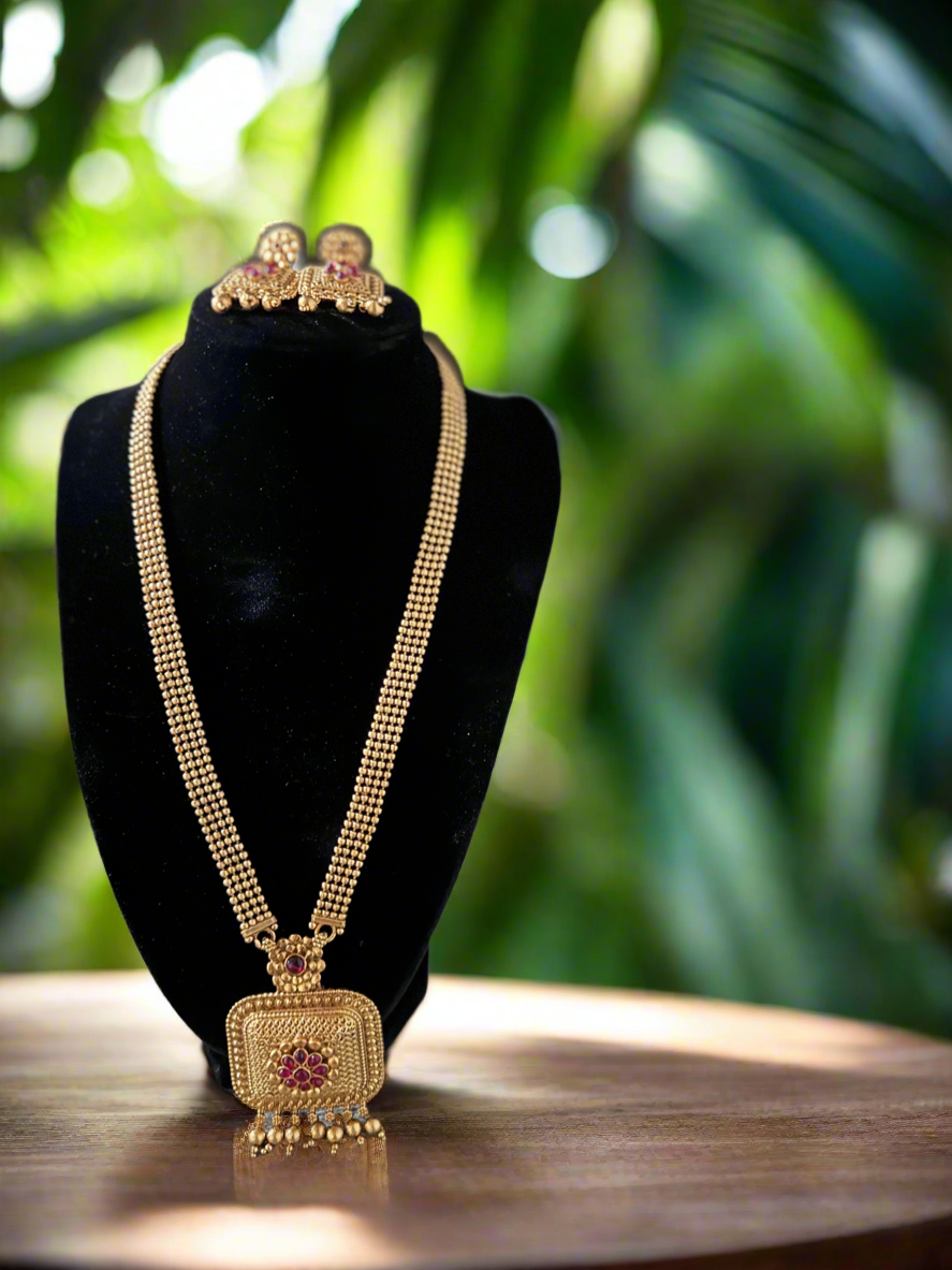 A traditional South Indian golden haram with golden hanging